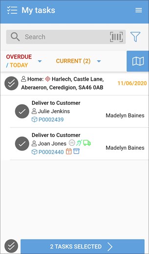Click on the Number (in this case, 2) of deliveries to select all the deliveries to mark them as complete by selecting “2 Tasks Selected >”: