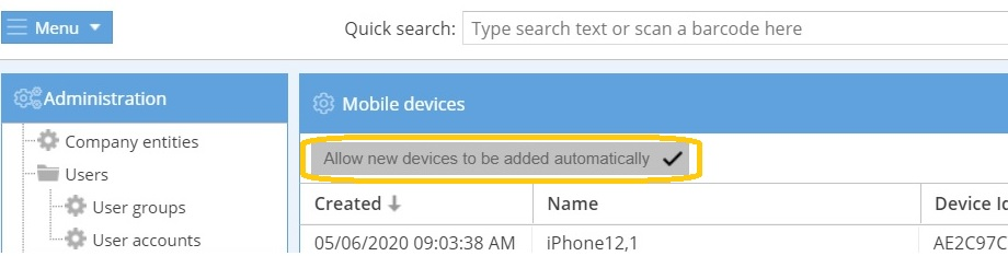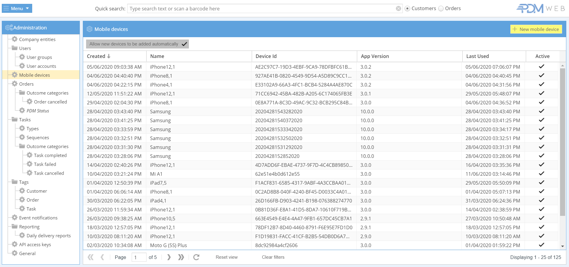 If you wish to manage which mobile devices can be used for PDM or prevent new devices from being used this can be done via the Administration module in PDM Web. Access the Administration module by clicking Menu > Administration > Mobile Devices.