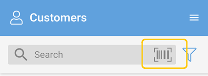 In the Customers module, tap the barcode scanner icon shown next to the search box. This will switch on your device camera to scan the barcode.