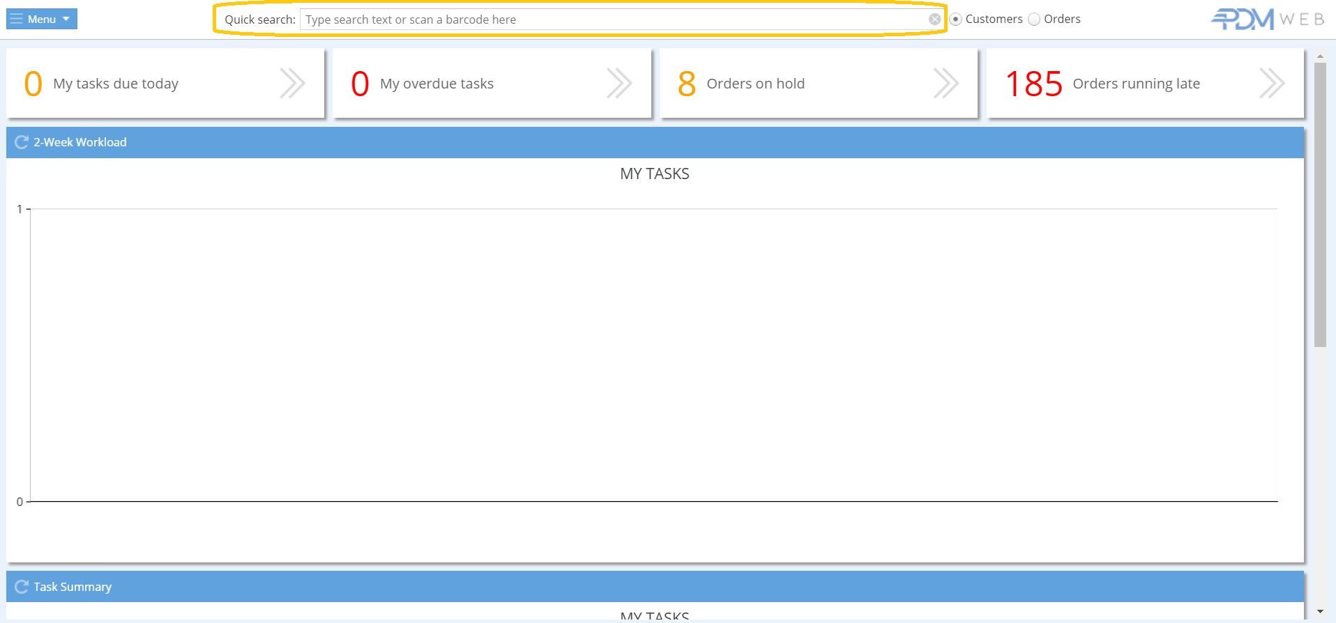 From the home screen, click the cursor into the Quick Search box, select the ‘Orders’ option and scan the barcode.