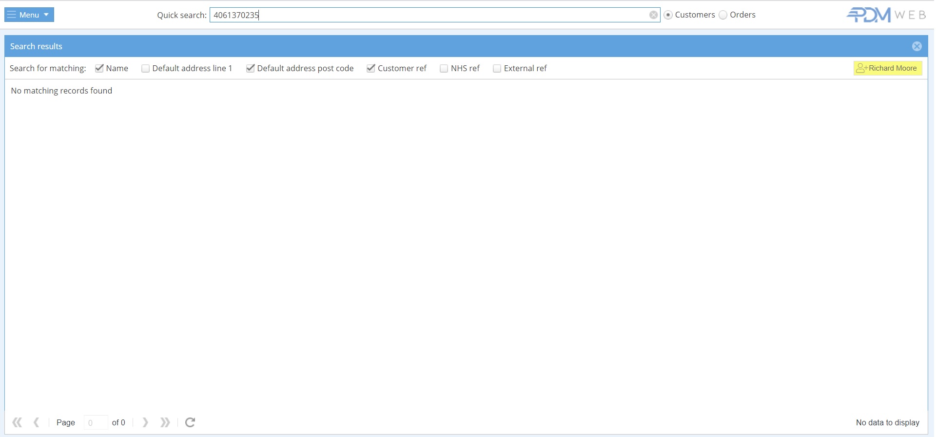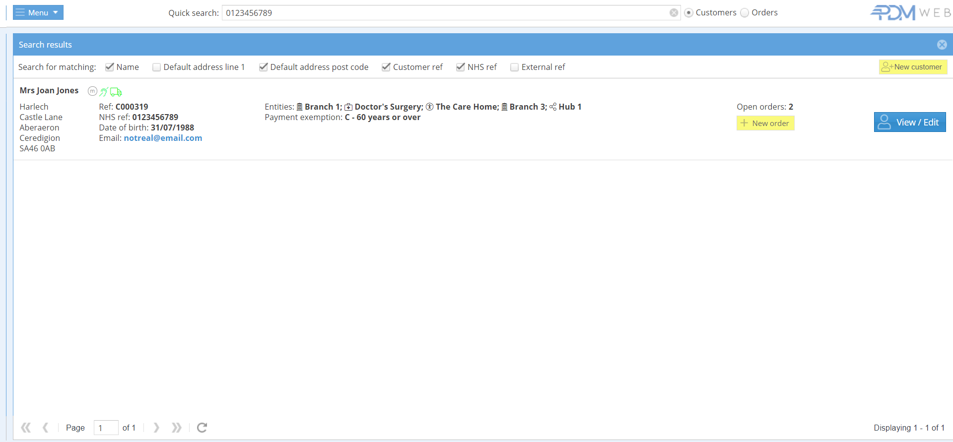 The information contained in the barcode will populate the search results. The “NHS ref” box must be ticked to find matching records. If the patient with matching NHS Ref is already in the database, their customer record will be displayed: