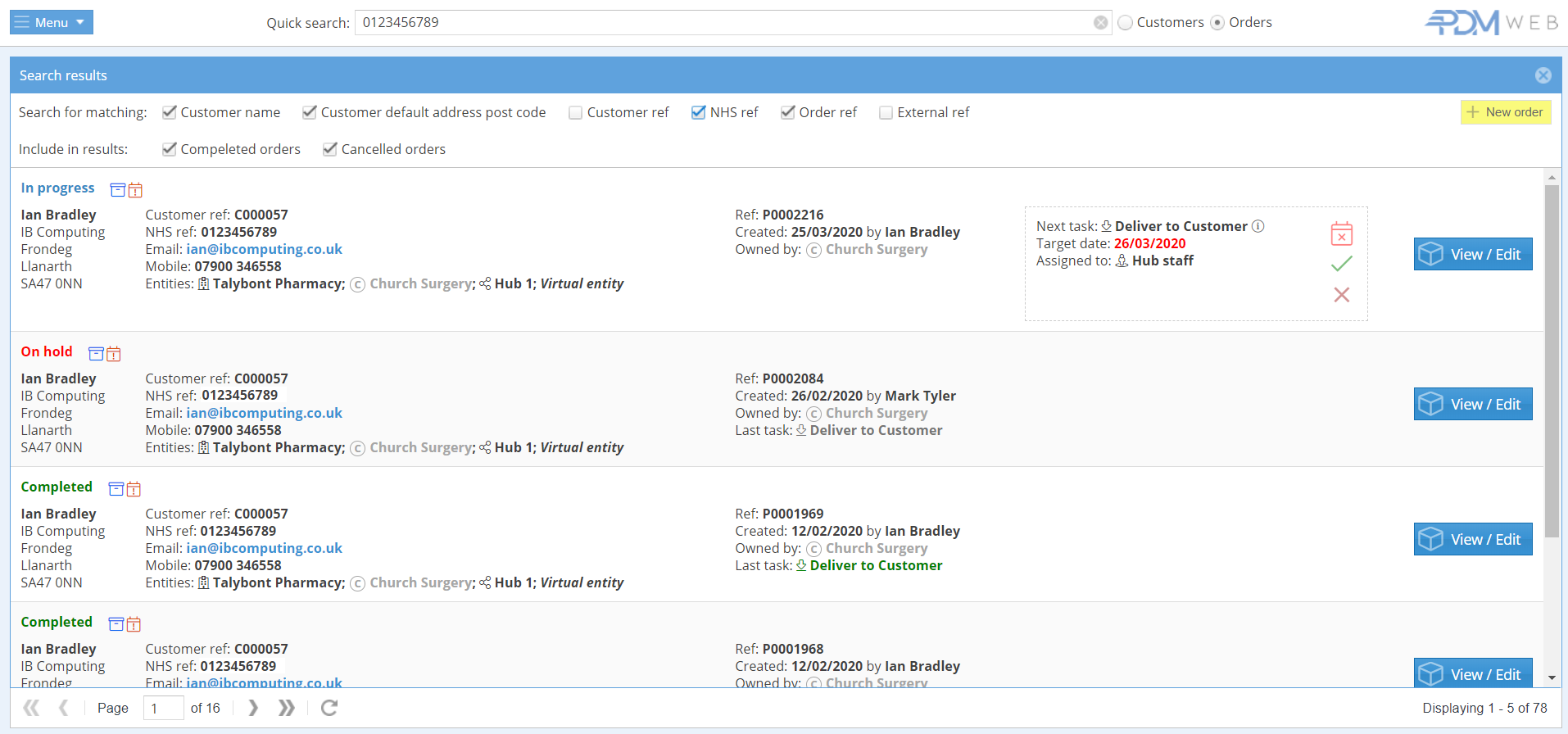 The “NHS ref” box must be ticked to find matching records. The Search will display all orders past and current, as well as tasks, relating to a customer with matching NHS Ref: