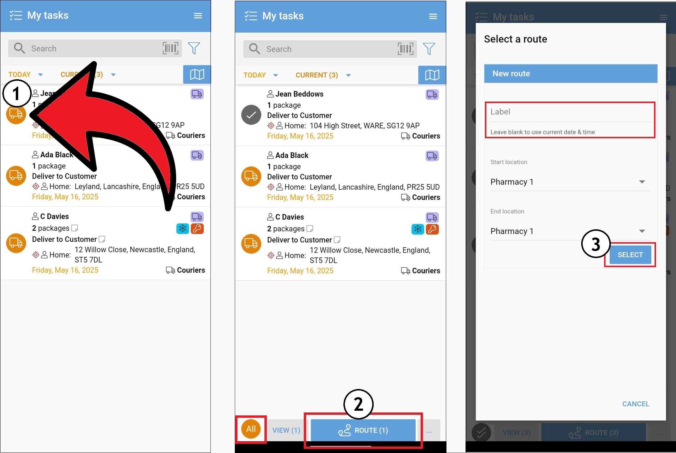 3. Name your route (optional), or leave it blank to use today’s date and tap Select to confirm.![]()