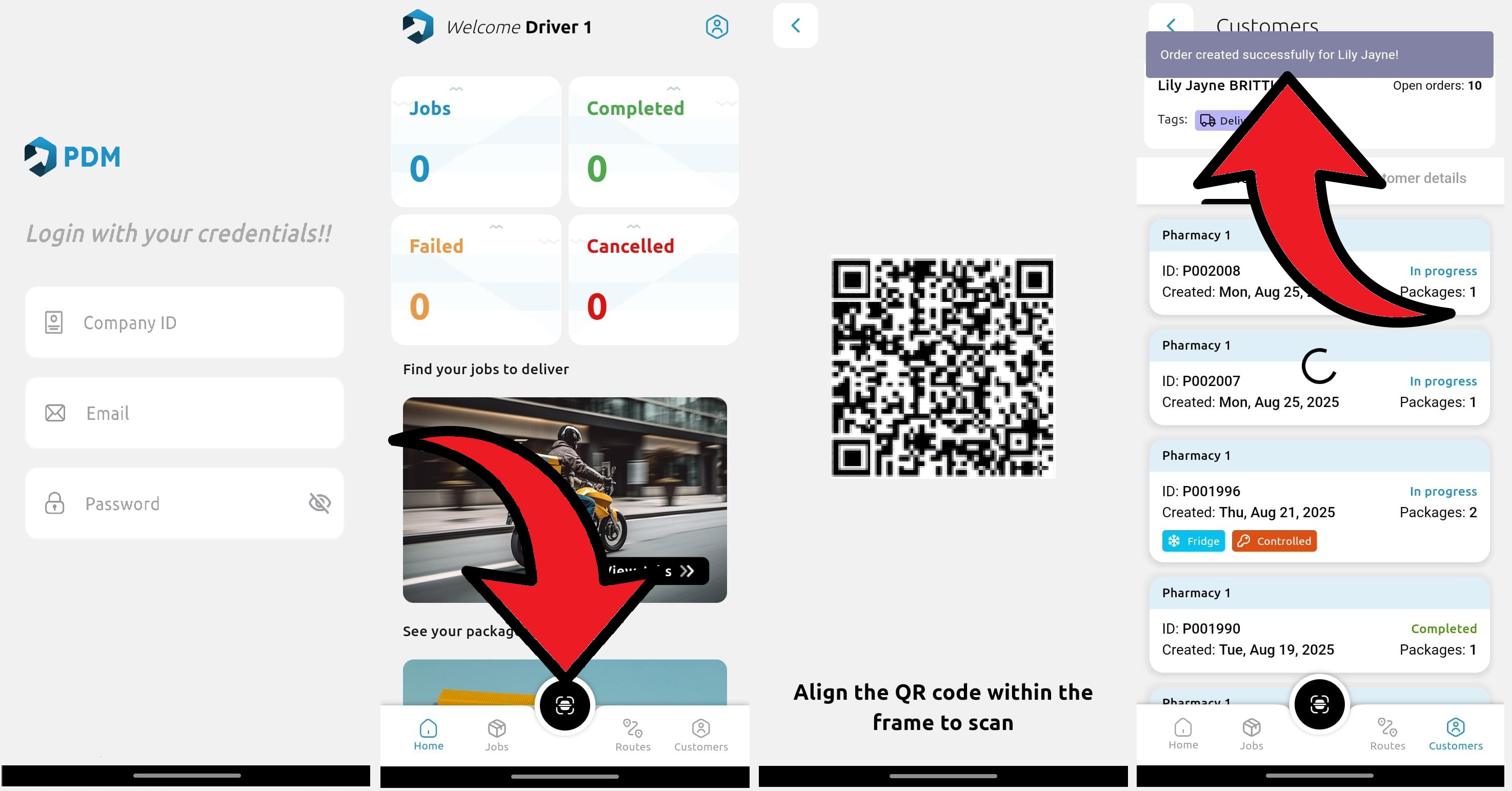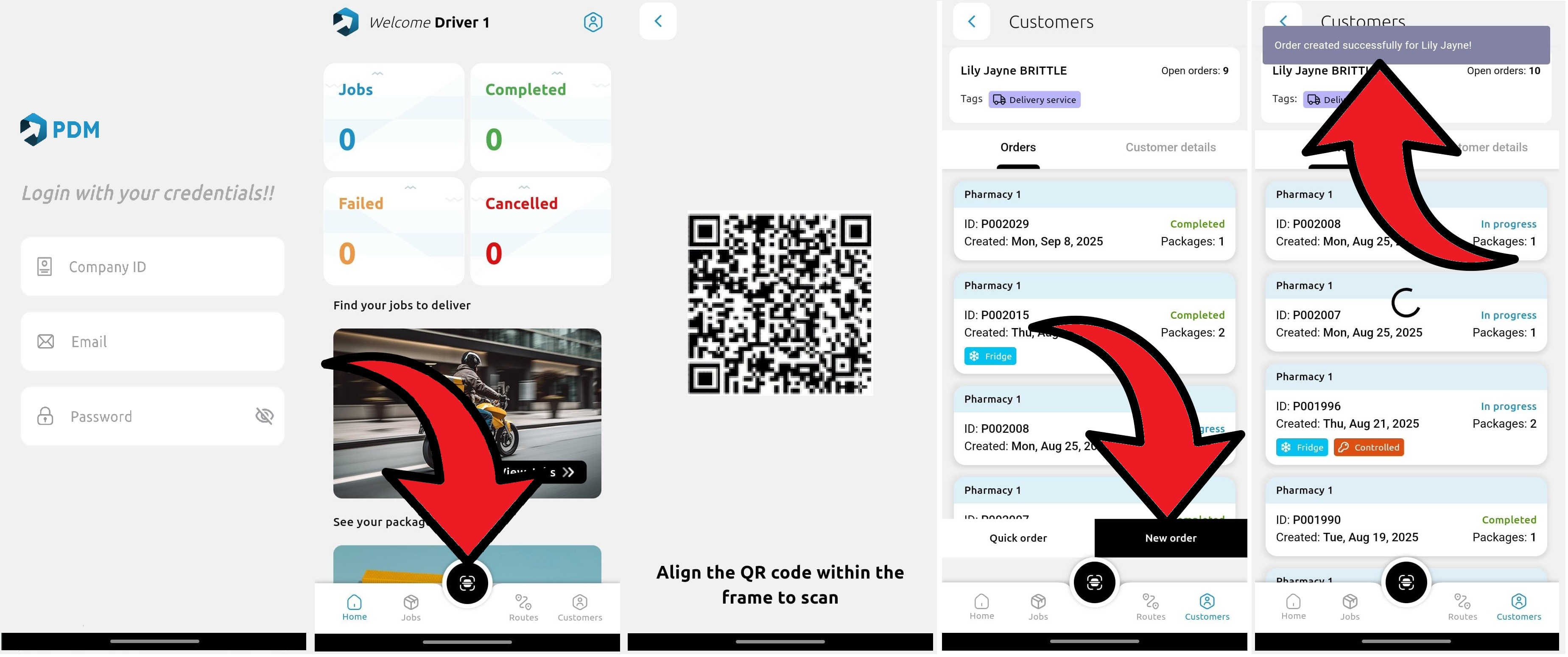 💡 Tip: If CD, Fridge tags or additional information are required for the delivery, instead of scanning from the Home page, go to Customers, use the barcode scan in the search bar and select +New Order. Follow the prompts on screen and tap Save when you're done.