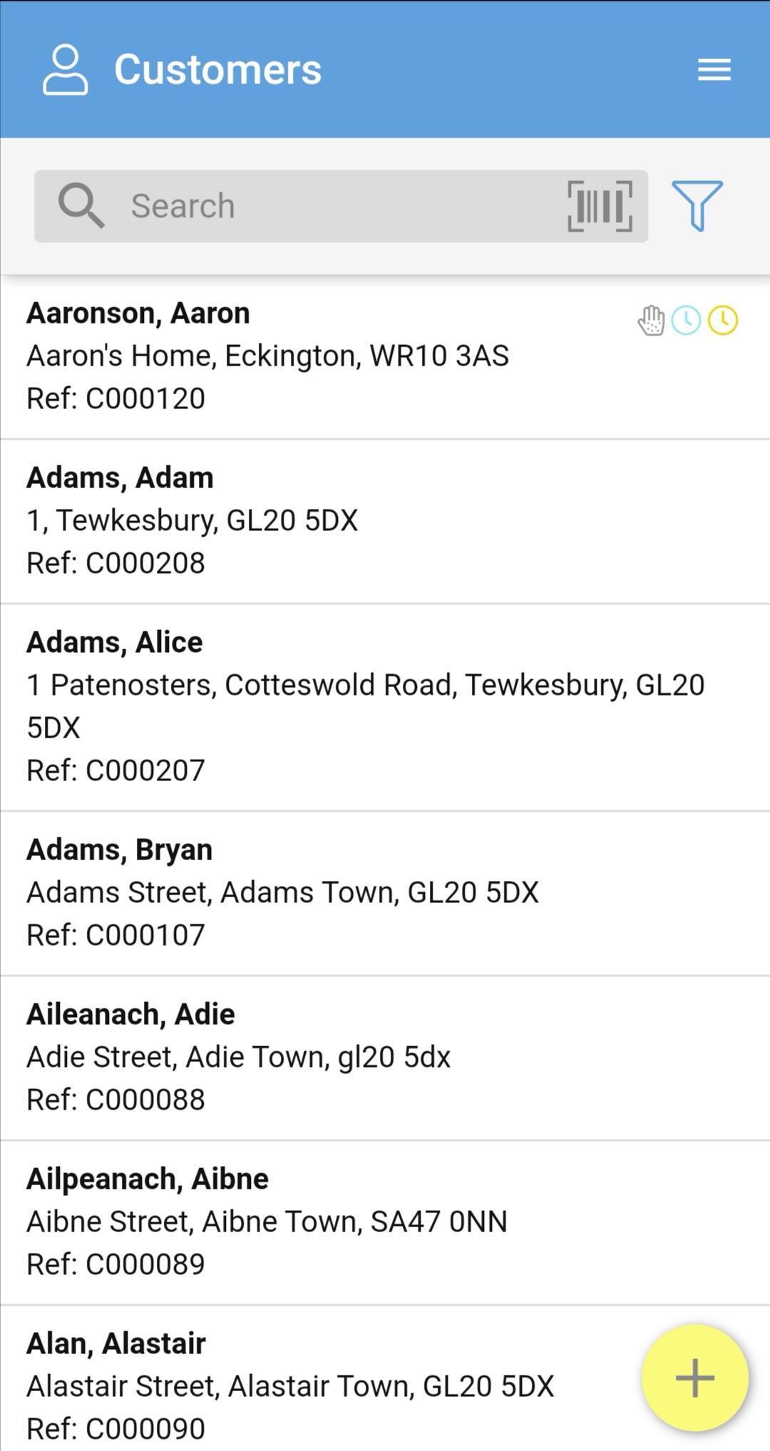 When you first open the Customer screen, you’ll be given an immediate overview of all your customers, including their name, address, reference number, and tags.