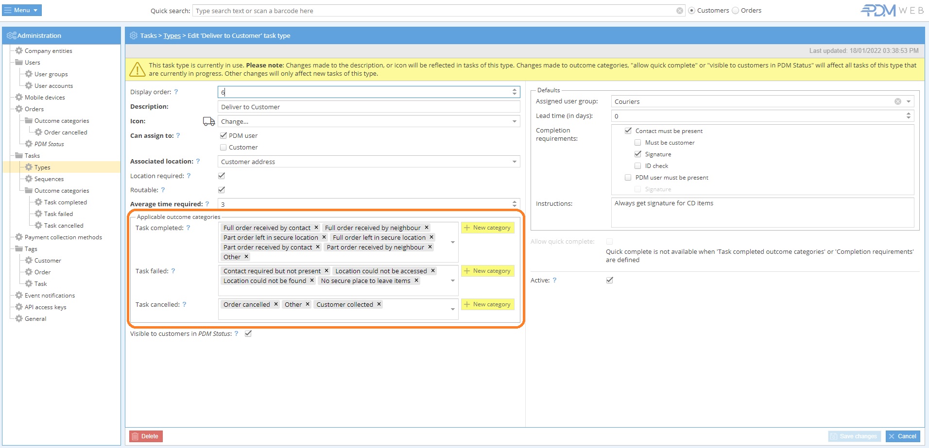 To edit existing Outcome categories, select the option on the left hand side menu (for example, to edit failed task outcome categories go to: Tasks > Outcome categories > Task failed).