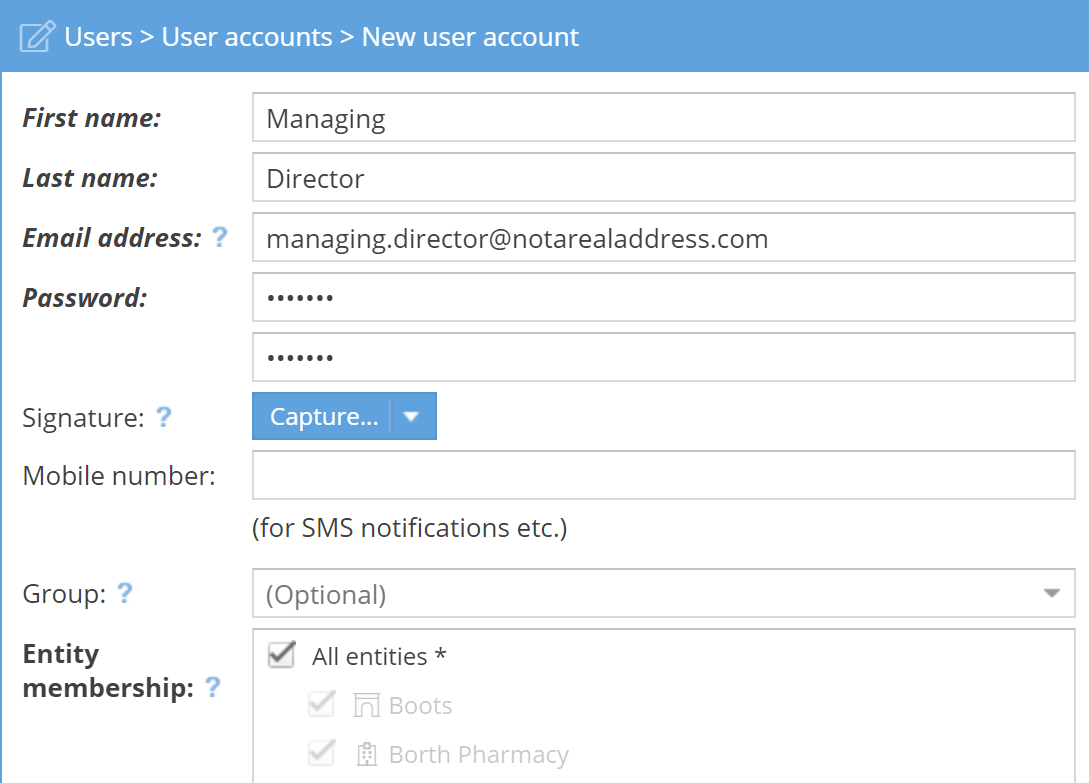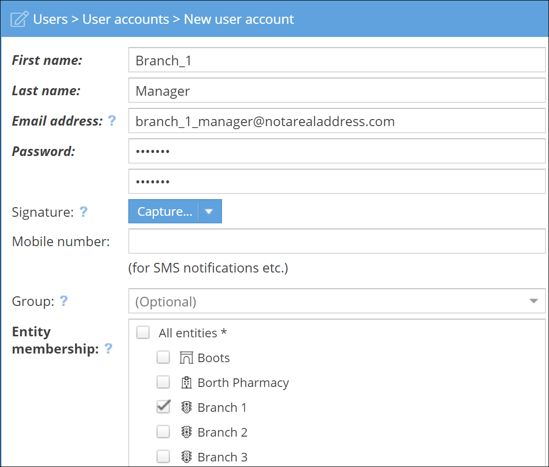 With all your entities set up, it’s time to create the users for those entities. Think about the people at each site who’ll need access to the system, and create user accounts for each one. As you create the user, assign them to the relevant entities (remember, users can be members of multiple entities).