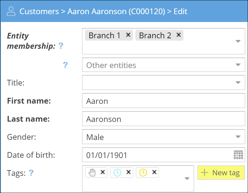 As you create your customers, just as with users, you have to select an entity for them to be a member of. You’ll be able to assign a customer to any entity you are a member of. So, from our earlier example, the Managing Director (with access to all entities) can add a customer to any entity. So if Aaron Aaronson is a customer with Branch 1, they can assign him to the Branch 1 entity.