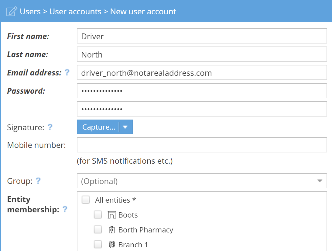 For our scenario, we’re going to create two drivers and assign them to the areas (North and South) they cover. We’re also going to assign them to the Couriers user group.