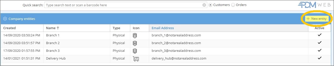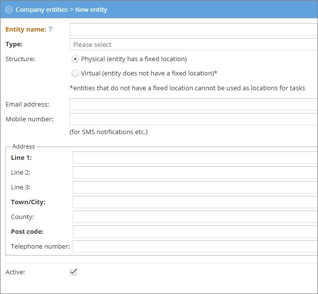Entities could represent physical locations, such as offices, depots, or hubs; or virtual locations such as delivery regions. Every user must be a member of an entity, so it’s important to create the entities you need before you start creating users or setting anything else up.