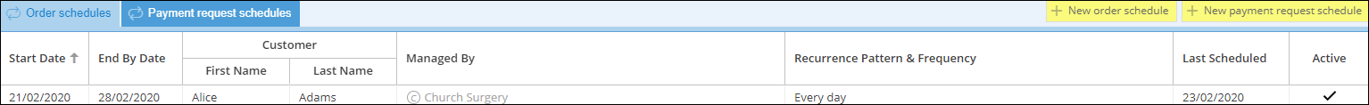 To create a new schedule, click on the yellow + New order schedule button in the top right corner (alternatively, set up a schedule when you create a new order).