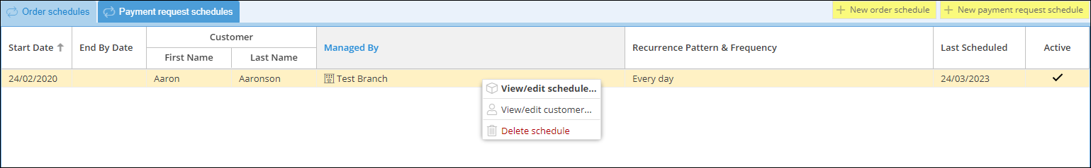 Modify existing schedules by opening the Schedule module and double-clicking on the schedule to be changed (or right-clicking and selecting 'View/edit schedule…').