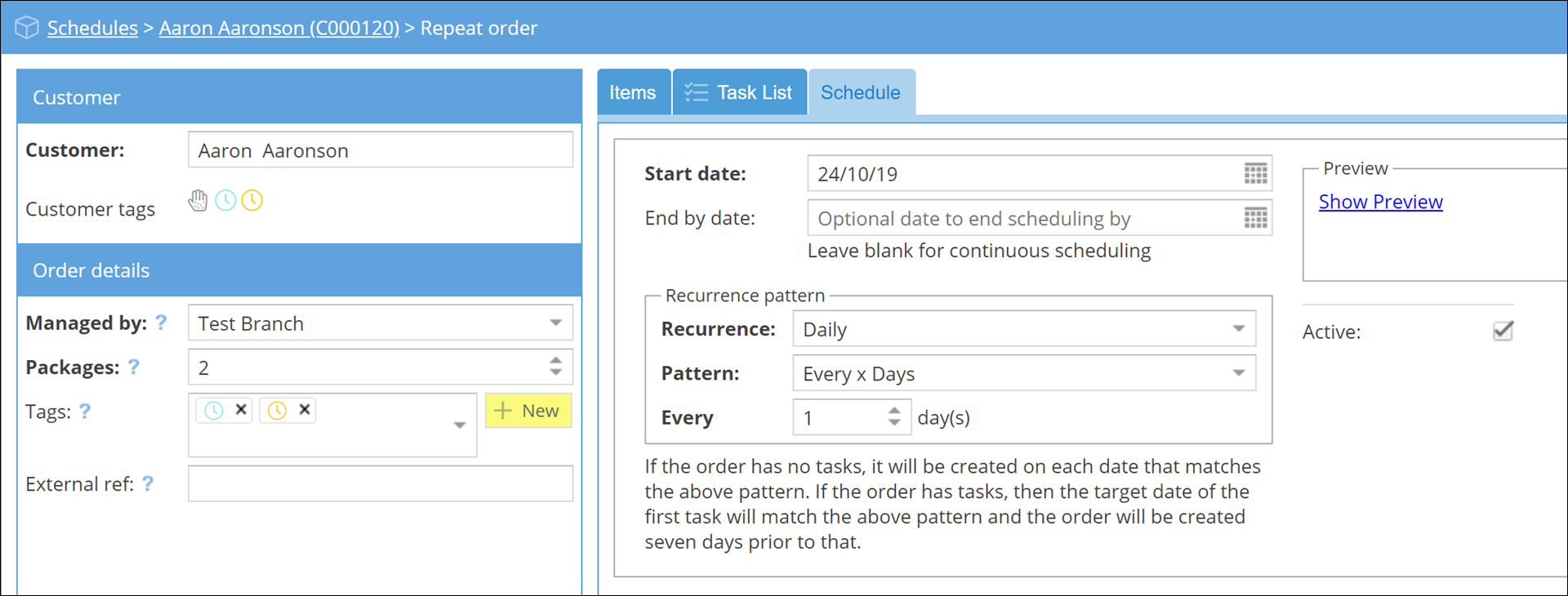 You can then change the schedule criteria (start date, end date, recurrence pattern, etc.), as well as the item and task list information.