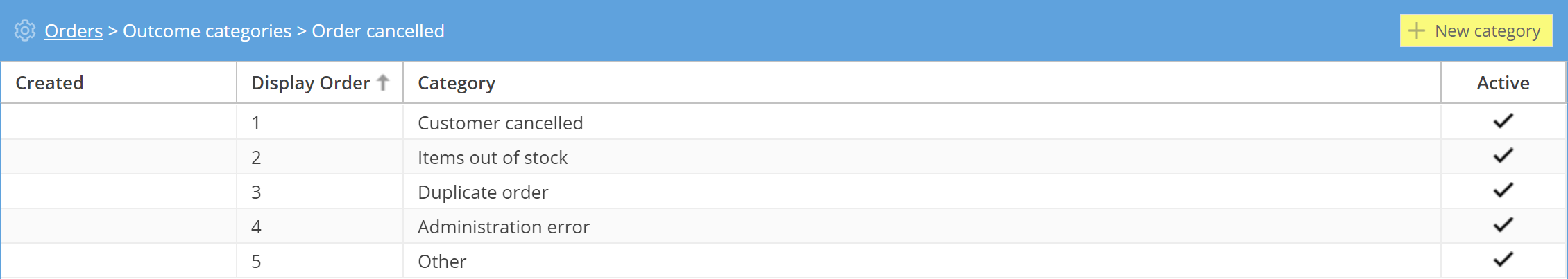 There are five cancelled order categories by default, but you can easily add more categories if necessary. Click on the yellow + New category button and fill in the description.