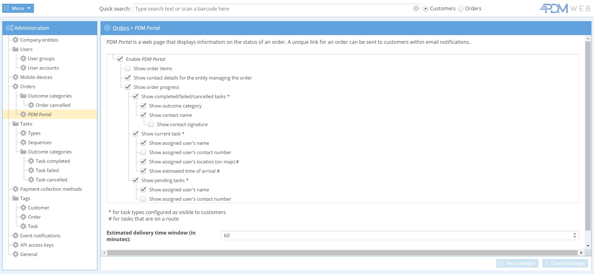 Here, choose what information is shown on the PDM Portal page, as well as how much time to allow in the estimated delivery time window.