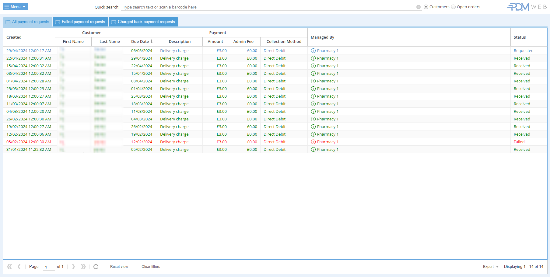 The options for this payment collection method are more limited since the status is updated automatically when PDM receives notifications regarding Direct Debit payments from our payment partner, GoCardless.