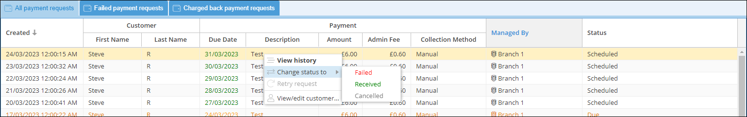 To update the status of a payment request, right-click on the record and choose the new status from the Change status to sub-menu.