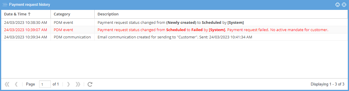 - PDM Communication: A log of email and SMS notifications created by PDM that relate to the payment request.