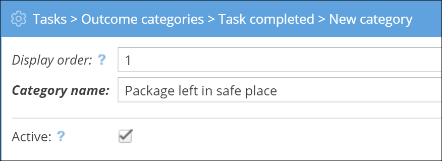 Choose a Category name that clearly describes the outcome. You can also choose a display order, if required, as well as confirming whether it is Active or not.