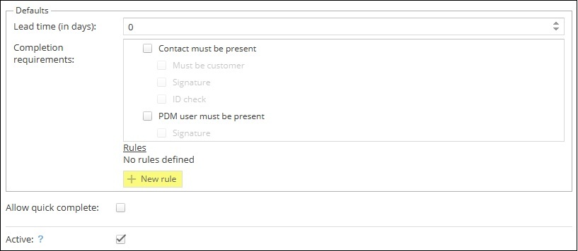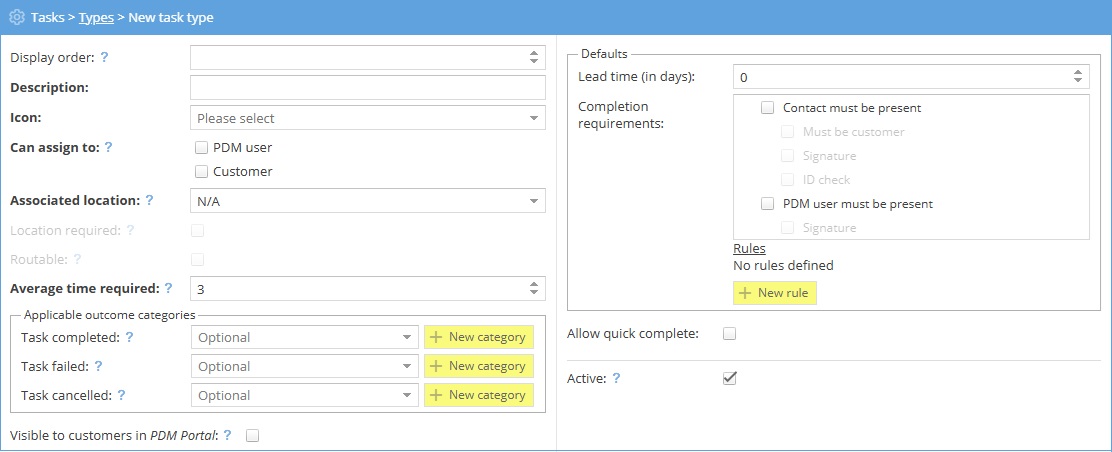 - Completion requirements - Does a contact have to be present to complete the task? If so, does it have to be the customer? Is a signature or ID check required? Does a PDM user have to be present? If so, do they need to sign to confirm the task has been carried out?