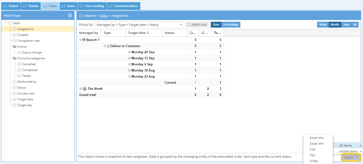 You can export the report by clicking the Export button in the bottom right corner. Select whether you want to export All items - all totals even if they're not visible on the screen - or just the Visible items - the ones that are visible on the screen at that moment.
