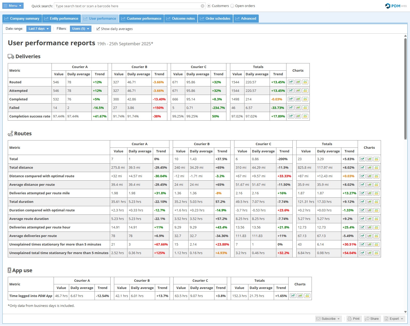 This report allows pharmacy managers to get quick insights into the performance of delivery drivers, providing easy comparisons between drivers and identifying developing trends.